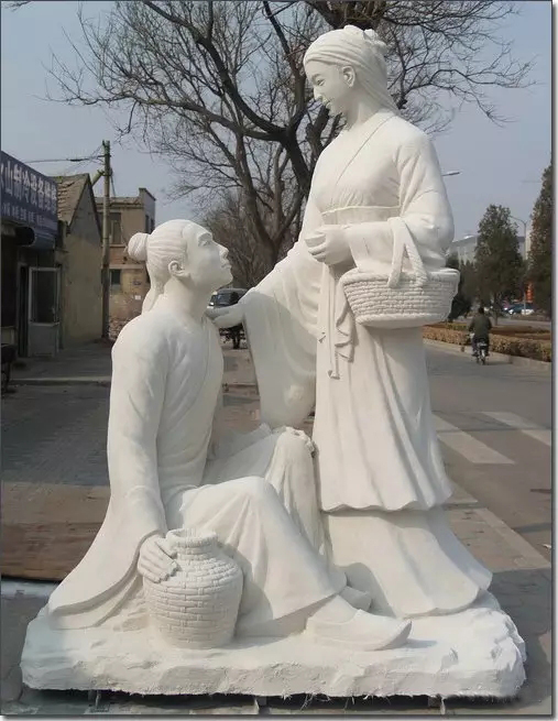 其实我更喜欢制作成功的玻璃钢雕塑作品,漂母的优雅婉约,娴静恬淡,眼神中的怜惜与鼓励,都在一颦一笑一个衣褶一个提动态中体现,仿真石材的效果让韩信的体态更显坚实,所说是落难英雄,看到韩信仰望漂母的感觉,感恩之心悠然而生,或许这就是此雕塑所表现的真实意义吧。漂母韩信玻璃钢雕塑最终的安放地点是淮安的一所中学,仰望古人,心怀感恩,后世不忘前世之师,念却先闲展望未来,怀古论今继往开来。