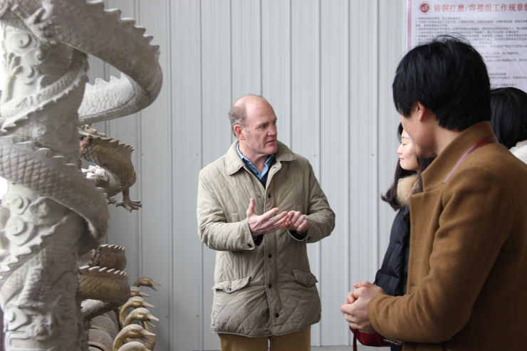 英国客户来厂实地考察,商讨铸铜凤凰雕塑制作事宜。