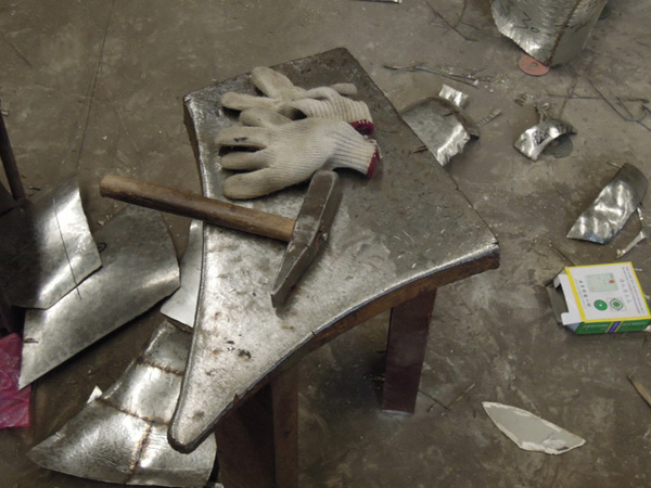用玻璃钢制作的模型强度会比较好,不用担心像泥塑的模型那样容易碰坏。采用冷作加工的方式时,工人们会将整个雕塑的外表面分割成很多个小块,并且会对每个块进行编号。用于不锈钢冷作加工的原材料是事先做好的不同厚度的不锈钢板,工人们需要在不锈钢板上根据编好号的每一个小区域,画出与之对应的形状。由于不锈钢板是平面的,而雕塑作品的表面是立体的,所以一是每个小块的面积不能太大,另外每个小块也需要留有一定的余地来方便之后的加工。